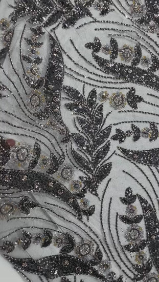 A delicate net crafted with fine threads, intricately embroidered or woven to form a beautiful pattern. The net is embellished with an array of multi-color crystals, adding vibrant sparkle and elegance